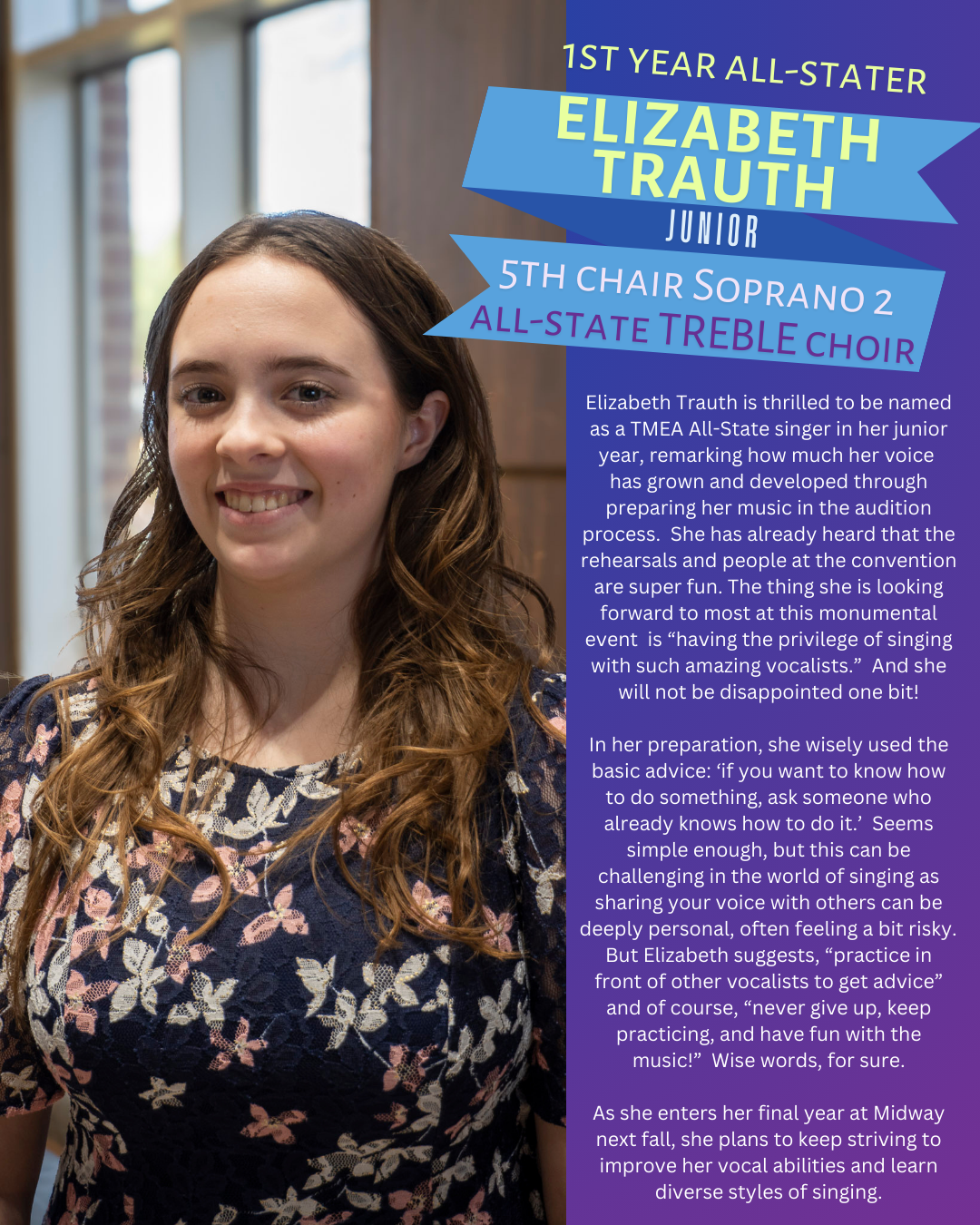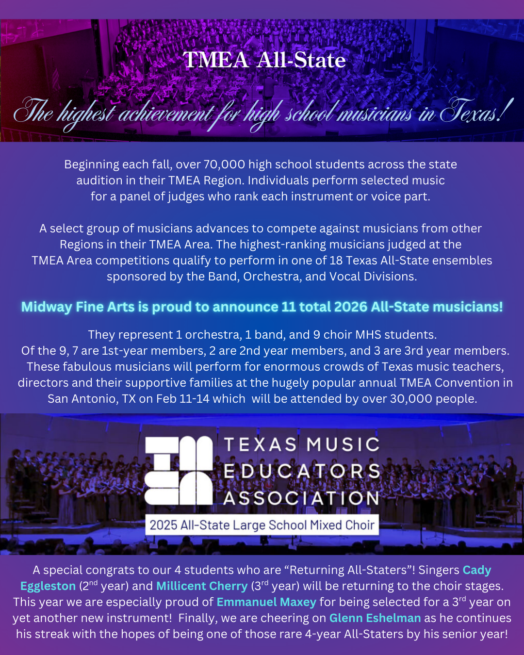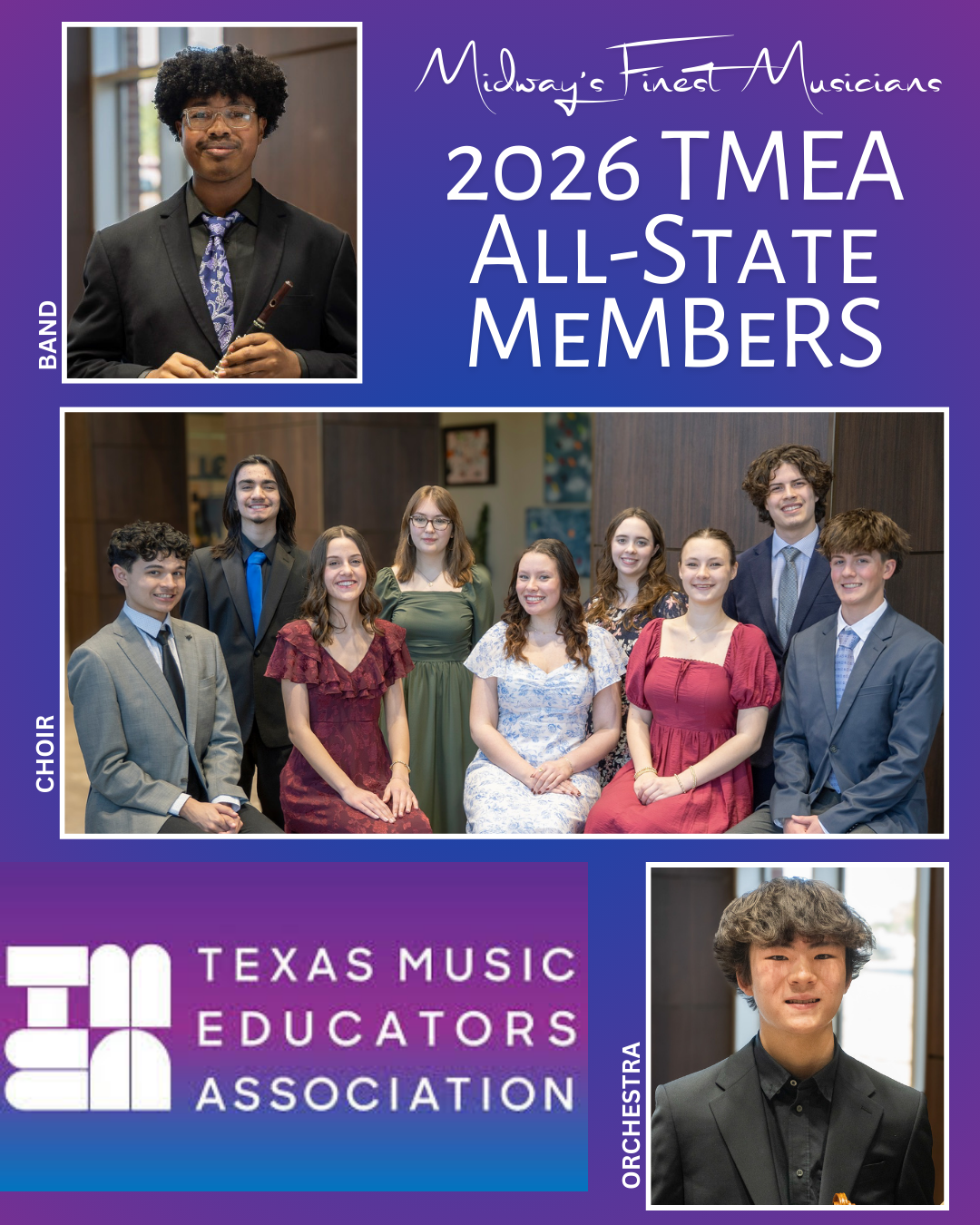After nearly 8 months of hard work, the BIG WEEK is here!!! An enormous CONGRATULATIONS to each of these wonderful and hard-working students on achieving the highest honor a Texas high school musician can achieve. We are beyond Midway PROUD!