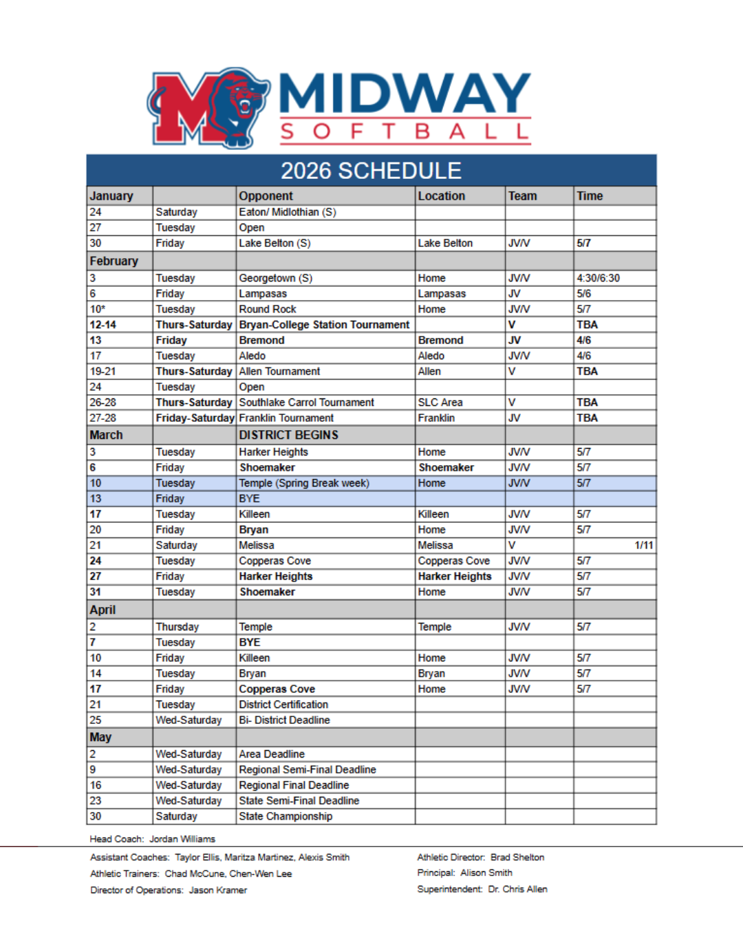 Head Softball Coach: Jordan Williams, jordan.williams@midwayisd.org